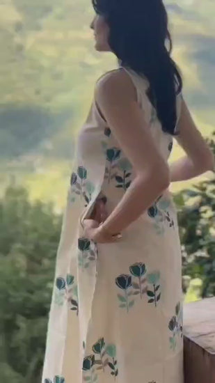 Beige Floral Print Cotton Sleeveless Kurta Set for Women