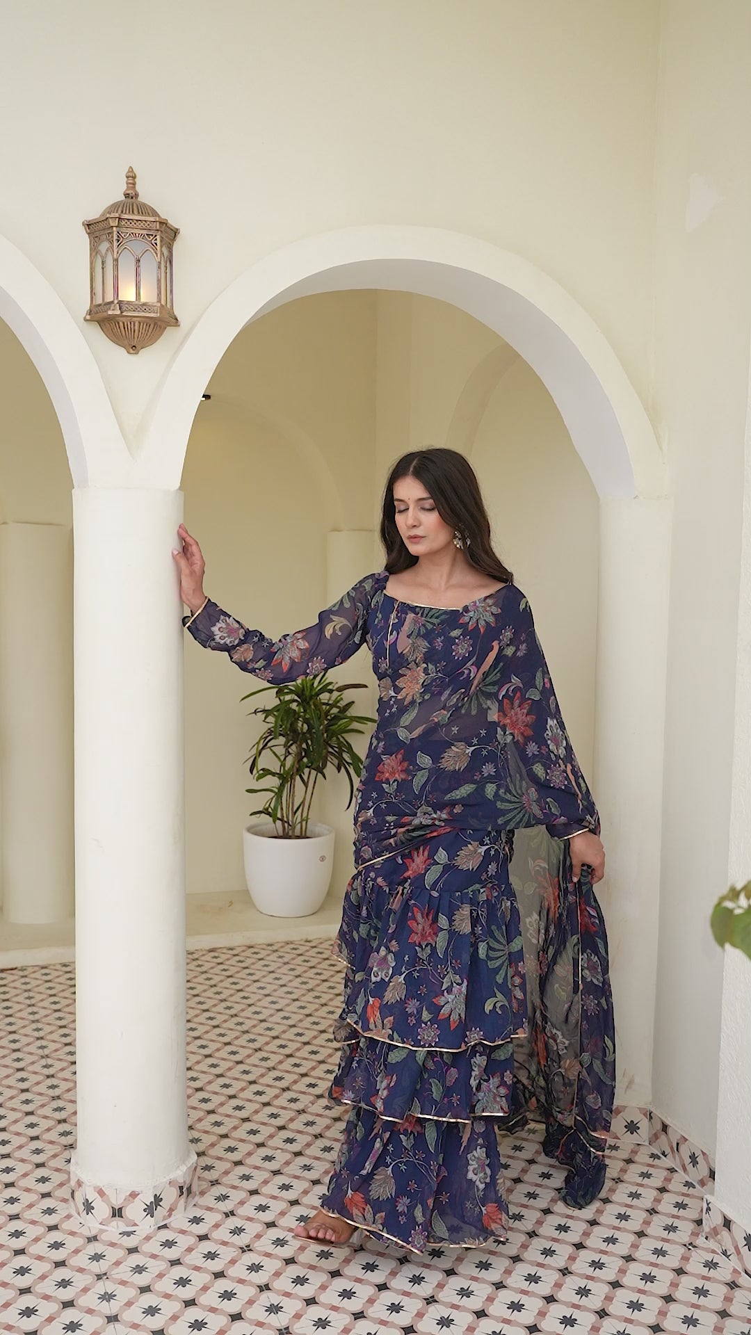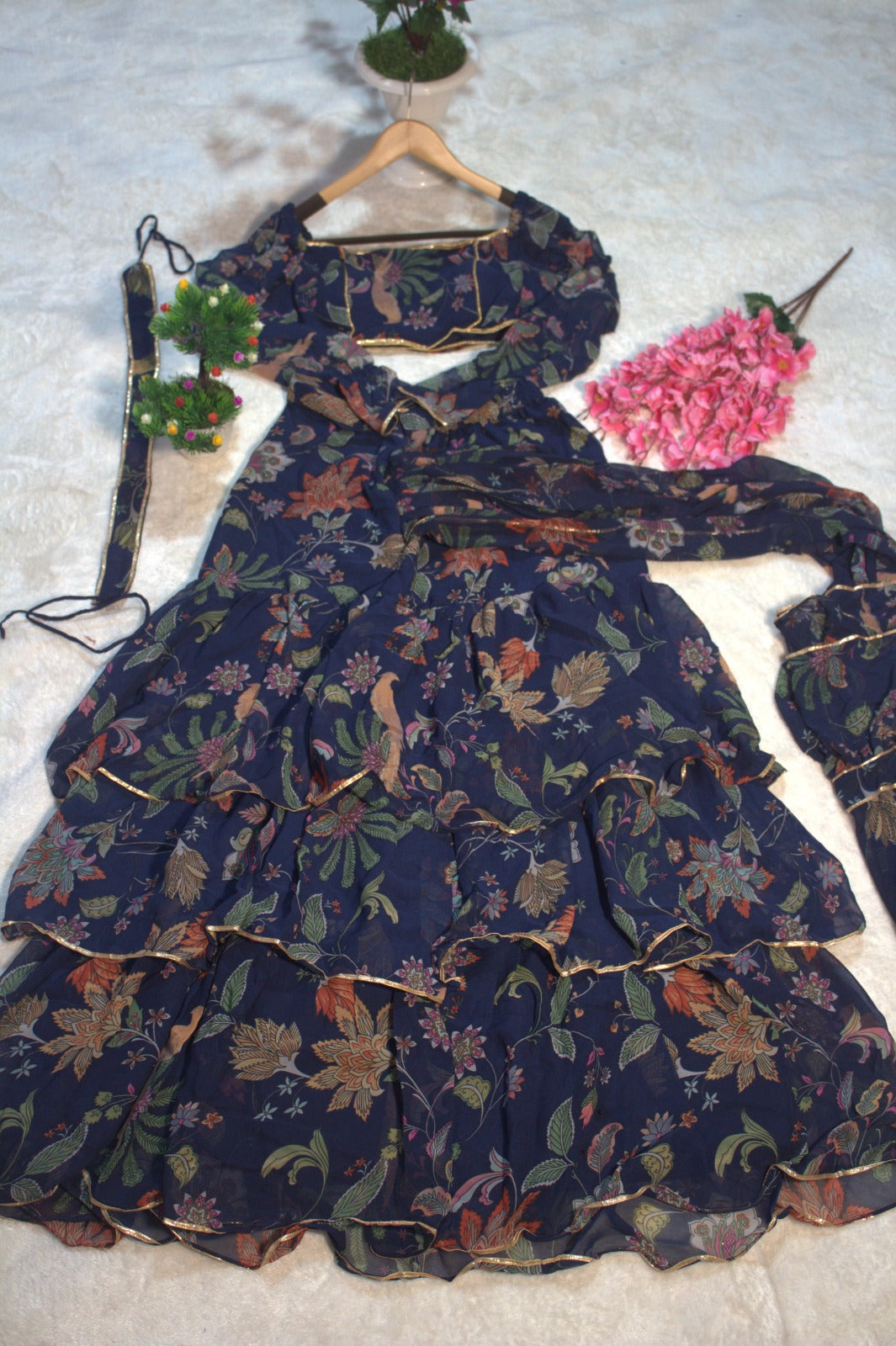 Make A Stunning Statement In This Ready-To-Wear 3-Layer Ruffle Georgette Saree Featuring Beautiful Floral Digital Prints And A Graceful Lace Border—Paired With A Full-Sleeve Stitched Blouse For A Flawless, Flowy Look