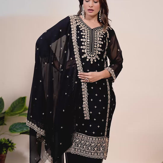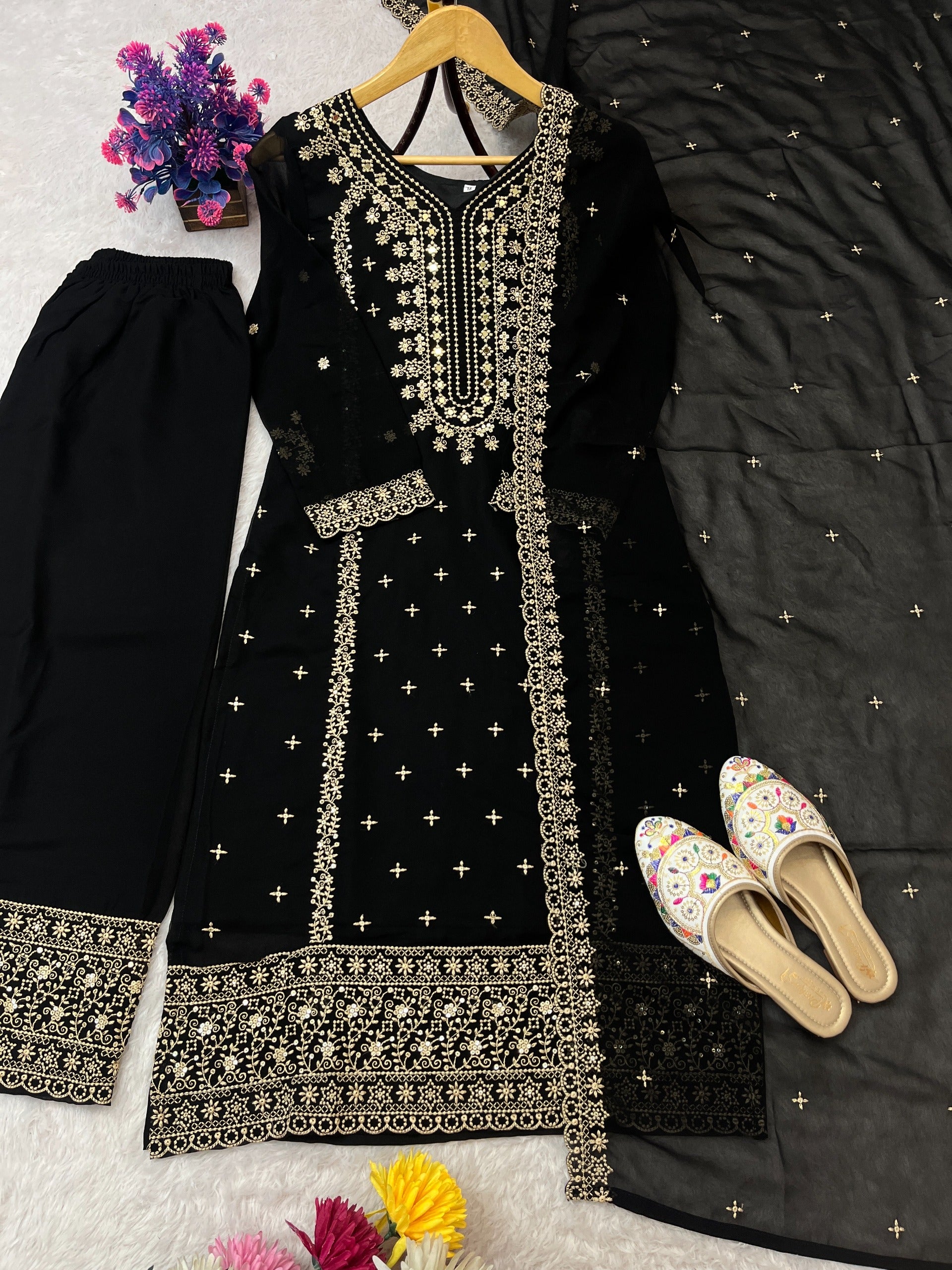 Designer Embroidery Sequence Work Black Top Pant With Dupatta Set