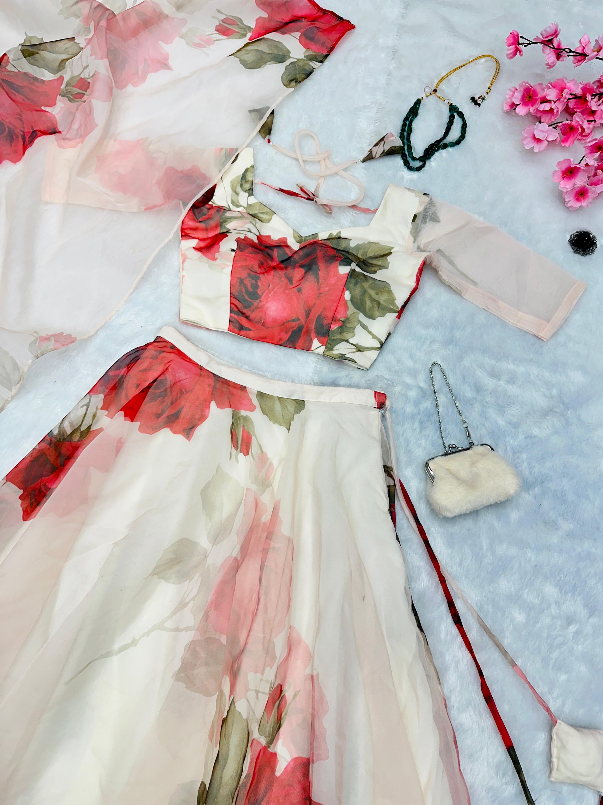 Lehenga: Pure organza silk floral printed lehenga with 8-meter flair and canvas patta