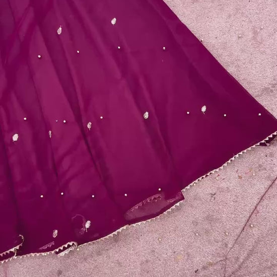 The gown is made from heavy fox georgette fabric featuring beautiful embroidery sequence work. It has a fully flared design that adds elegance and volume, making it perfect for festive and special occasions.