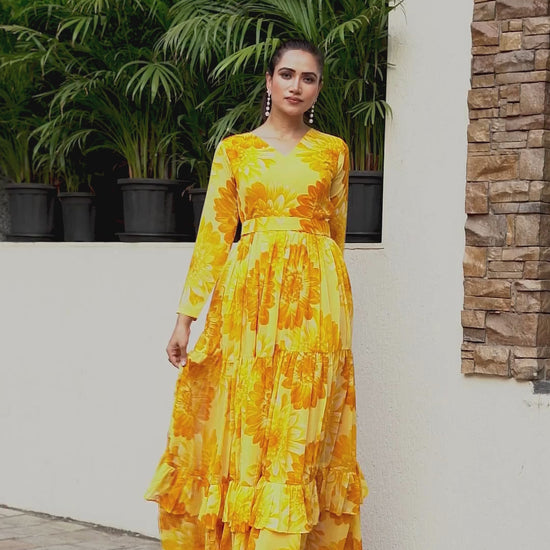 Lotus 6 Meter Flared Yellow Georgette Maxi Gown