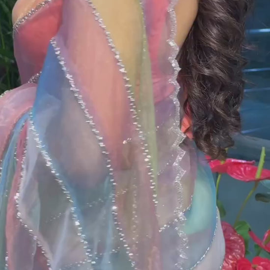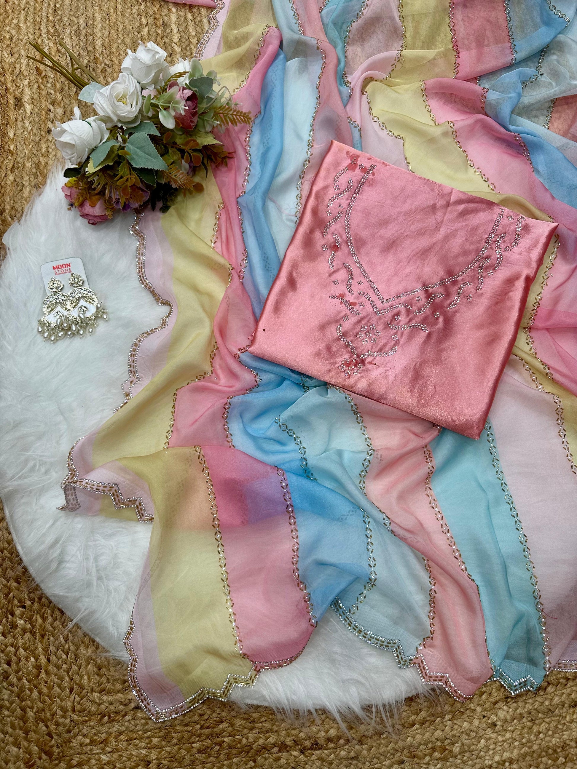 Multi colour Digital Printed Tabby Silk Saree with Diamond Work