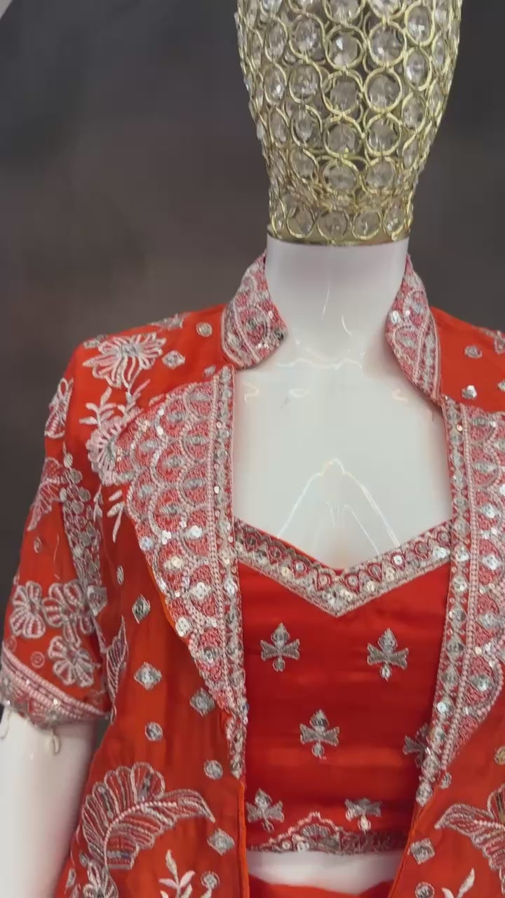 Orange Silk Lehenga Choli Set with Embroidered Blouse And Koti