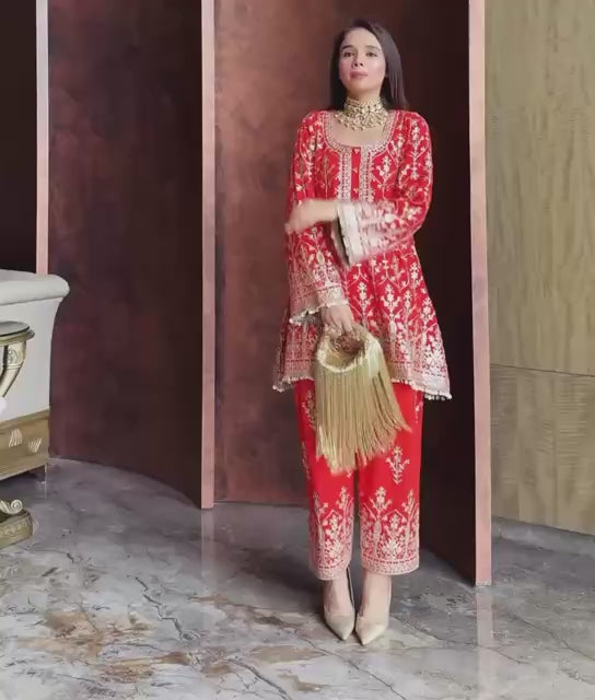 Top Fabric: Heavy Faux Georgette with Rich Embroidery 5 mm Sequin Work with Elegant Lace Trim with Stylish Bell Sleeves
