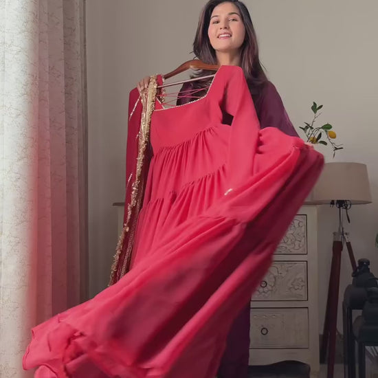 Red Faux Georgette Ruffle Style Anarkali Gown